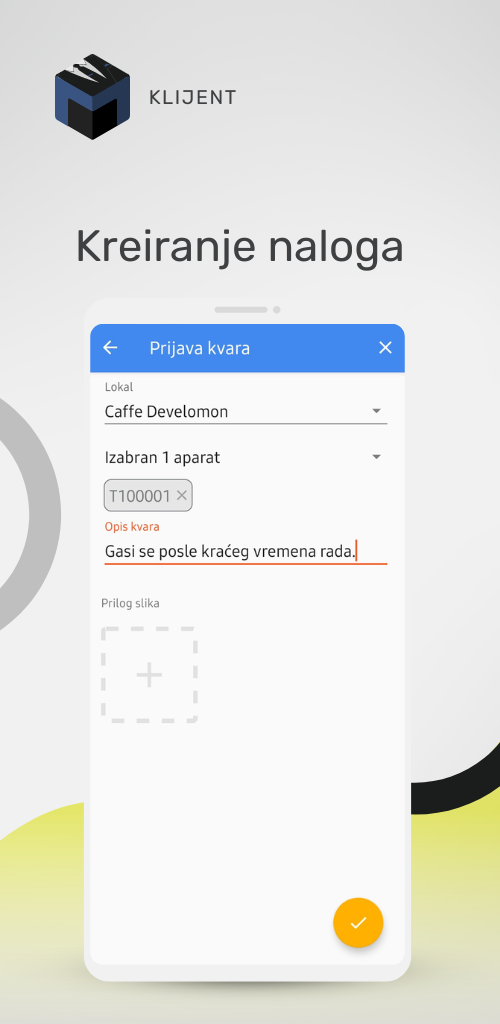 - Kreiranje naloga / prijava kvara - kreiranje naloga koji će sadržati sve potrebne informacije i biti vidljiv direktno tehničaru bez potrebe za dodatnom akcijom za definisanja parametara naloga.