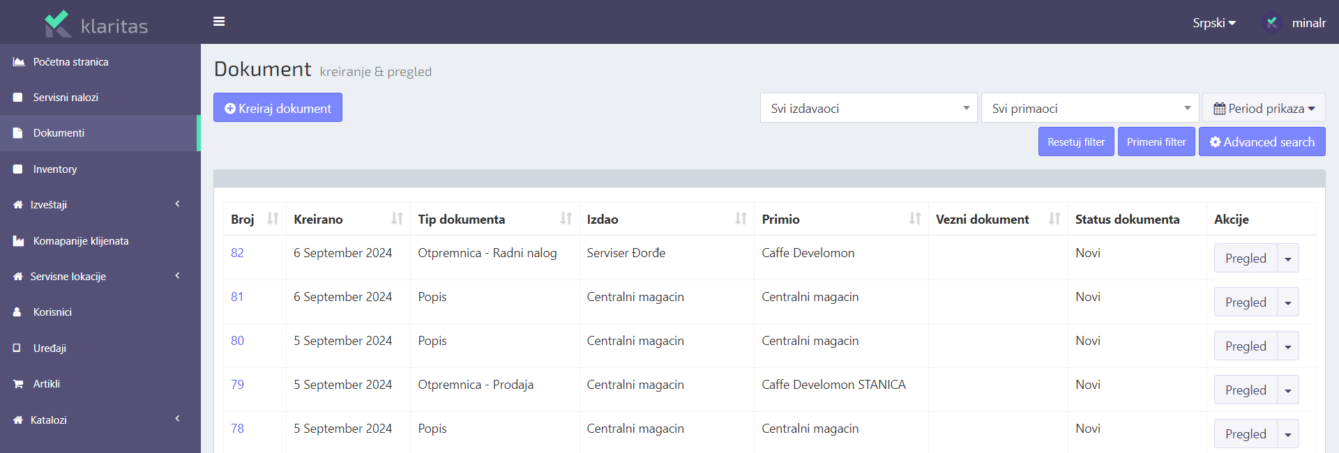 Kreiranje dokumenta se vrši izborom opcije “Dokumenti” u meniju sa leve strane, nakon čega se otvara tabelarni prikaz kreiranih dokumenata sa njihovim informacijama, kao i opcijama za filtriranje.