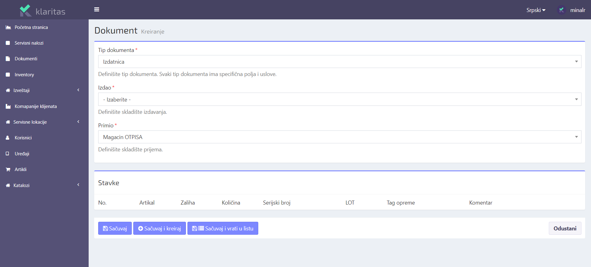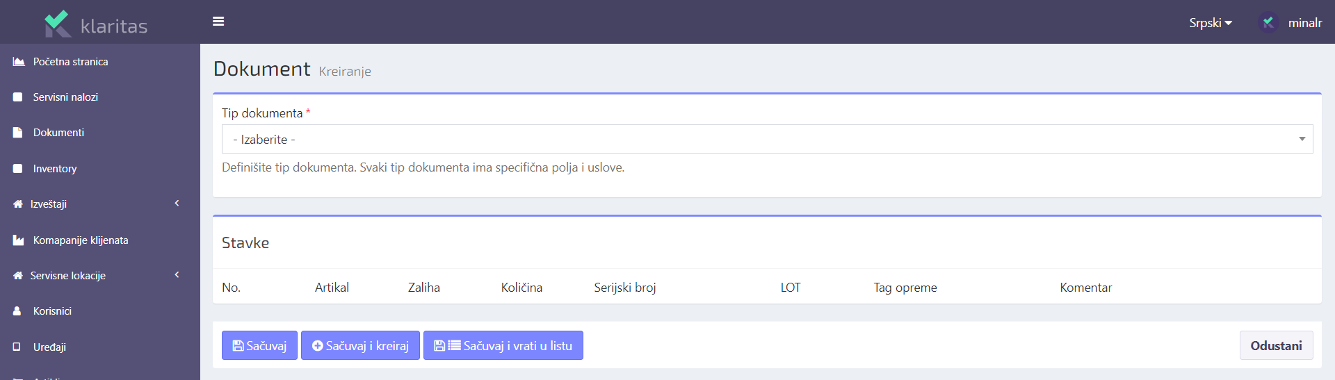 Klikom na dugme “Kreiraj dokument” otvara se forma za kreiranje dokumenta, gde je na početku potrebno izabrati tip dokumenta (otpremnica, ulaz dobavljača i izdatnica).