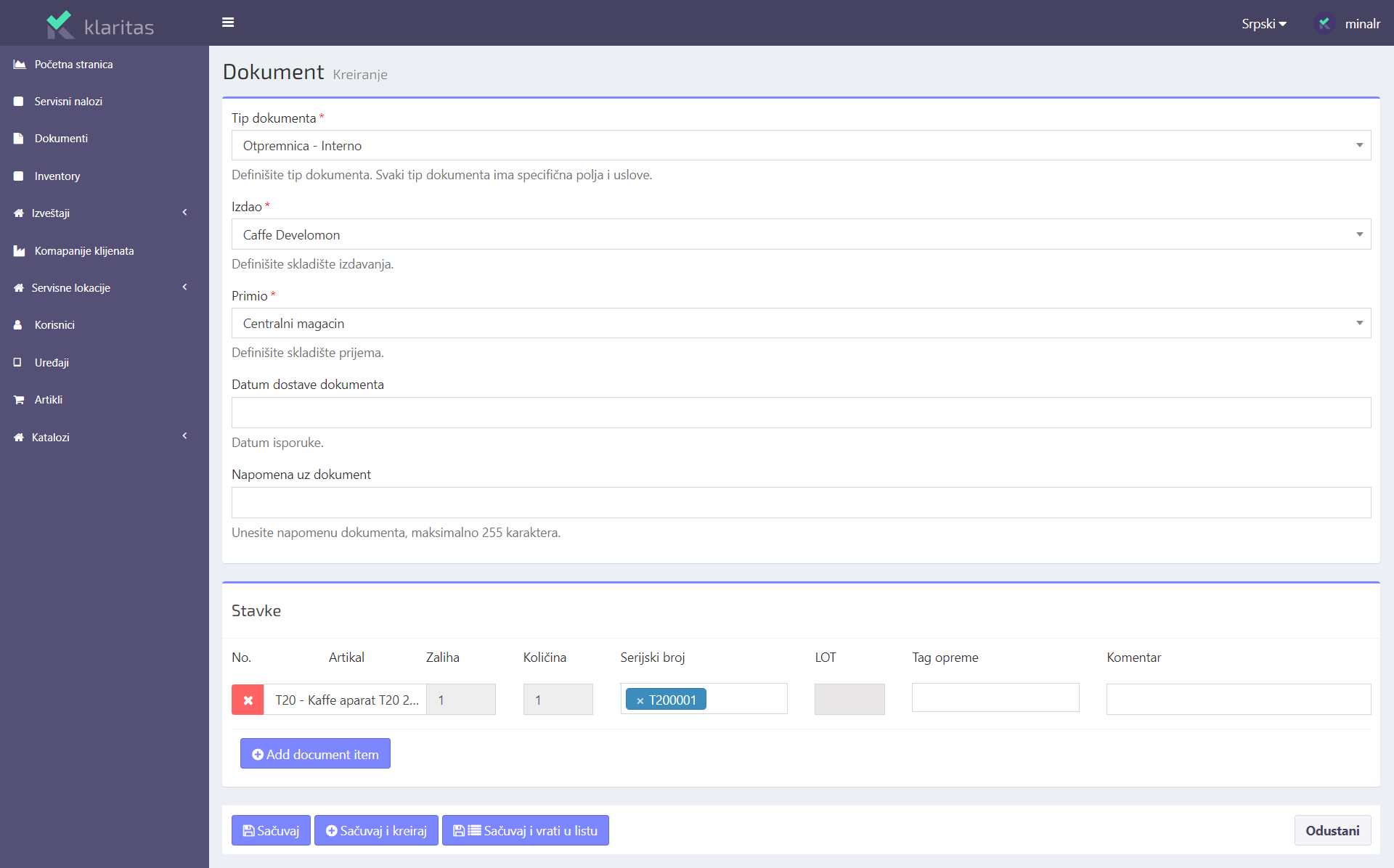 kreira se dokument kojim se evidentira izlaz nekog artikla ili opreme, odnosno evidencija prenosa između magacina ili poslovnih jedinica u okviru istog pravnog lica. Prilikom kreiranja dokumenta, definiše se odakle se izdaje artikal, gde se zadužuje, kao i datum isporuke i propratni komentar. Nakon toga, u sekciji “Stavke” dodaju se artikli koji se evidentiraju preko kreiranja ovog dokumenta. Kada popune svi potrebni podaci, klikne se na dugme “Sačuvaj” (dugme “ Sačuvaj i kreiraj” - sačuva dokument i automatski otvori formu za kreiranje narednog dokumenta, dugme “Sačuvaj i vratu u listu” sačuva dokument i otvori prikaz glavni prikaz dokumenata), nakon čega se otvara pregled sa porukom da je uspešno kreiran dokument kao i broj dokumenta koji je dodeljen.