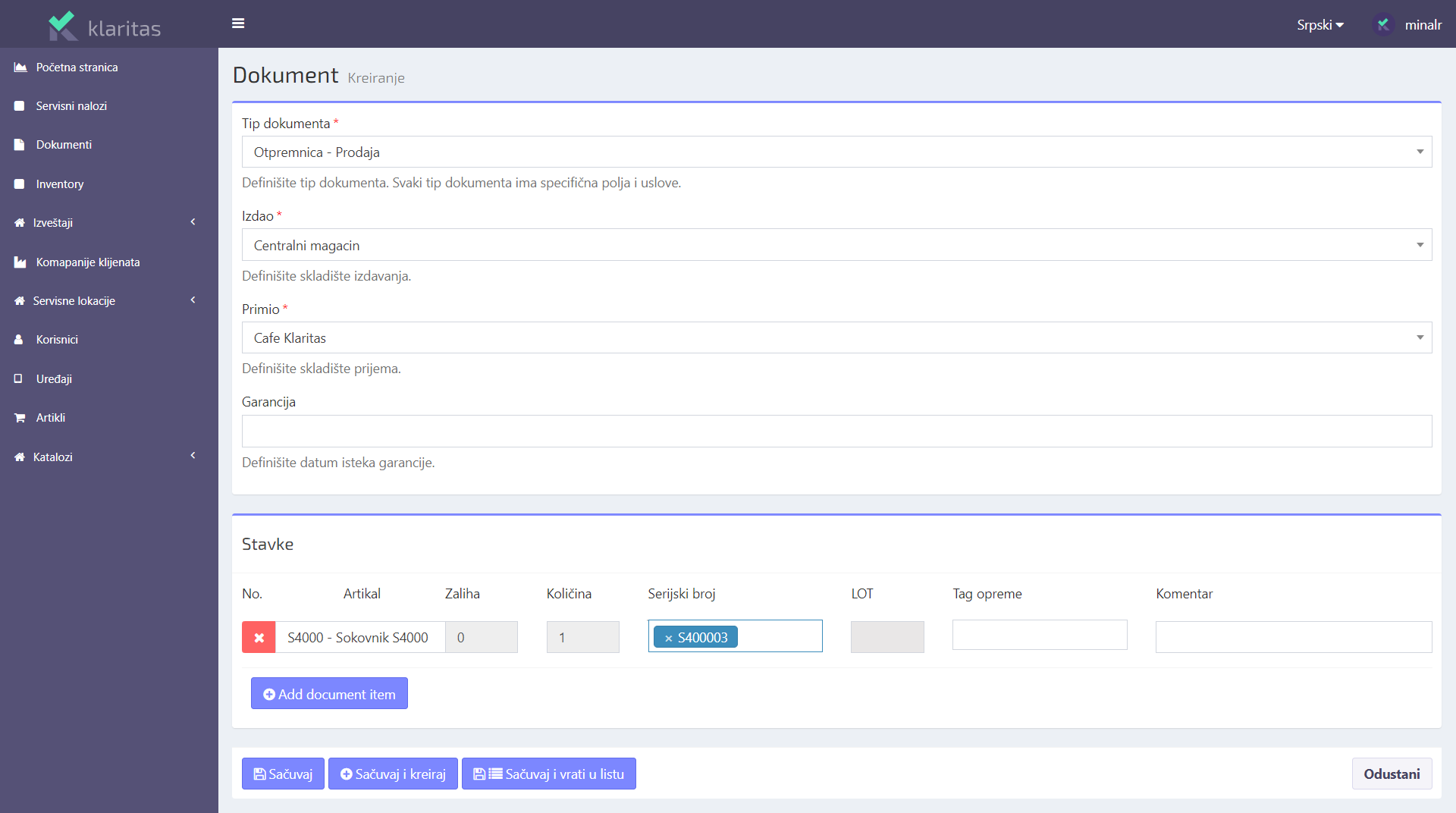 Kreira se dokument kojim se evidentira izlaz robe, odnosno opreme ili artikla iz skladišta ka krajnjem korisniku (kupcu). Prilikom kreiranja dokumenta, definiše se odakle se izdaje artikal, ko je kupac, datum isporuke, garancija artikla i propratni komentar. Nakon toga, u sekciji “Stavke” dodaju se artikli koji se evidentiraju preko kreiranja ovog dokumenta. Kada popune svi potrebni podaci, klikne se na dugme “Sačuvaj” (dugme “ Sačuvaj i kreiraj” - sačuva dokument i automatski otvori formu za kreiranje narednog dokumenta, dugme “Sačuvaj i vratu u listu” sačuva dokument i otvori prikaz glavni prikaz dokumenata), nakon čega se otvara pregled sa porukom da je uspešno kreiran dokument kao i broj dokumenta koji je dodeljen.
