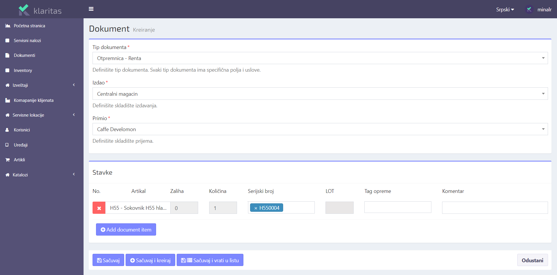 Kreira se dokument kojim se evidentira izlaz robe, odnosno opreme ili artikla koji se rentira kakrajnjem korisniku. Prilikom kreiranja dokumenta, definiše se odakle se izdaje artikal, gde se zadužuje, kao i datum isporuke i propratni komentar. Nakon toga, u sekciji “Stavke” dodaju se artikli koji se evidentiraju preko kreiranja ovog dokumenta. Kada popune svi potrebni podaci, klikne se na dugme “Sačuvaj” (dugme “ Sačuvaj i kreiraj” - sačuva dokument i automatski otvori formu za kreiranje narednog dokumenta, dugme “Sačuvaj i vratu u listu” sačuva dokument i otvori prikaz glavni prikaz dokumenata), nakon čega se otvara pregled sa porukom da je uspešno kreiran dokument kao i broj dokumenta koji je dodeljen.