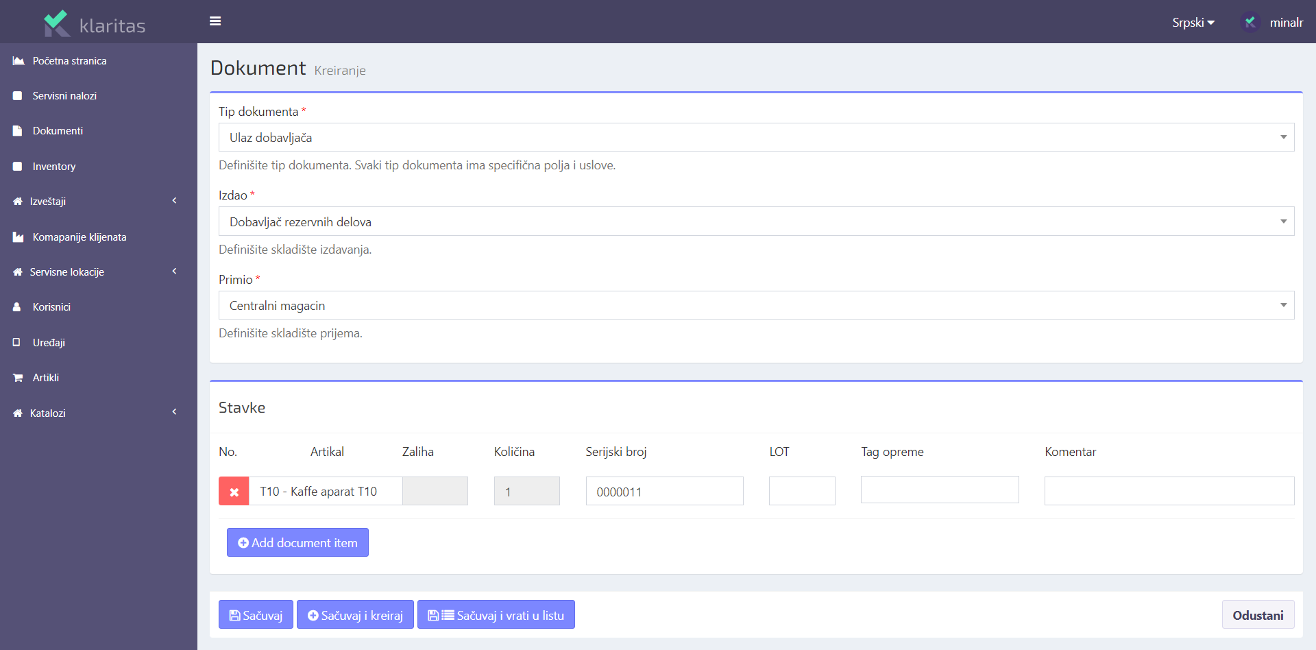 Kreira se dokument kojim se evidentira ulaz robe, odnosno opreme i artikala. Prilikom kreiranja dokumenta, definiše se od koga se vrši prijem robe i gde se zadužuje. Nakon toga, u sekciji “Stavke” dodaju se artikli koji se evidentiraju preko kreiranja ovog dokumenta. Kada popune svi potrebni podaci, klikne se na dugme “Sačuvaj” (dugme “ Sačuvaj i kreiraj” - sačuva dokument i automatski otvori formu za kreiranje narednog dokumenta, dugme “Sačuvaj i vratu u listu” sačuva dokument i otvori prikaz glavni prikaz dokumenata), nakon čega se otvara pregled sa porukom da je uspešno kreiran dokument kao i broj dokumenta koji je dodeljen.